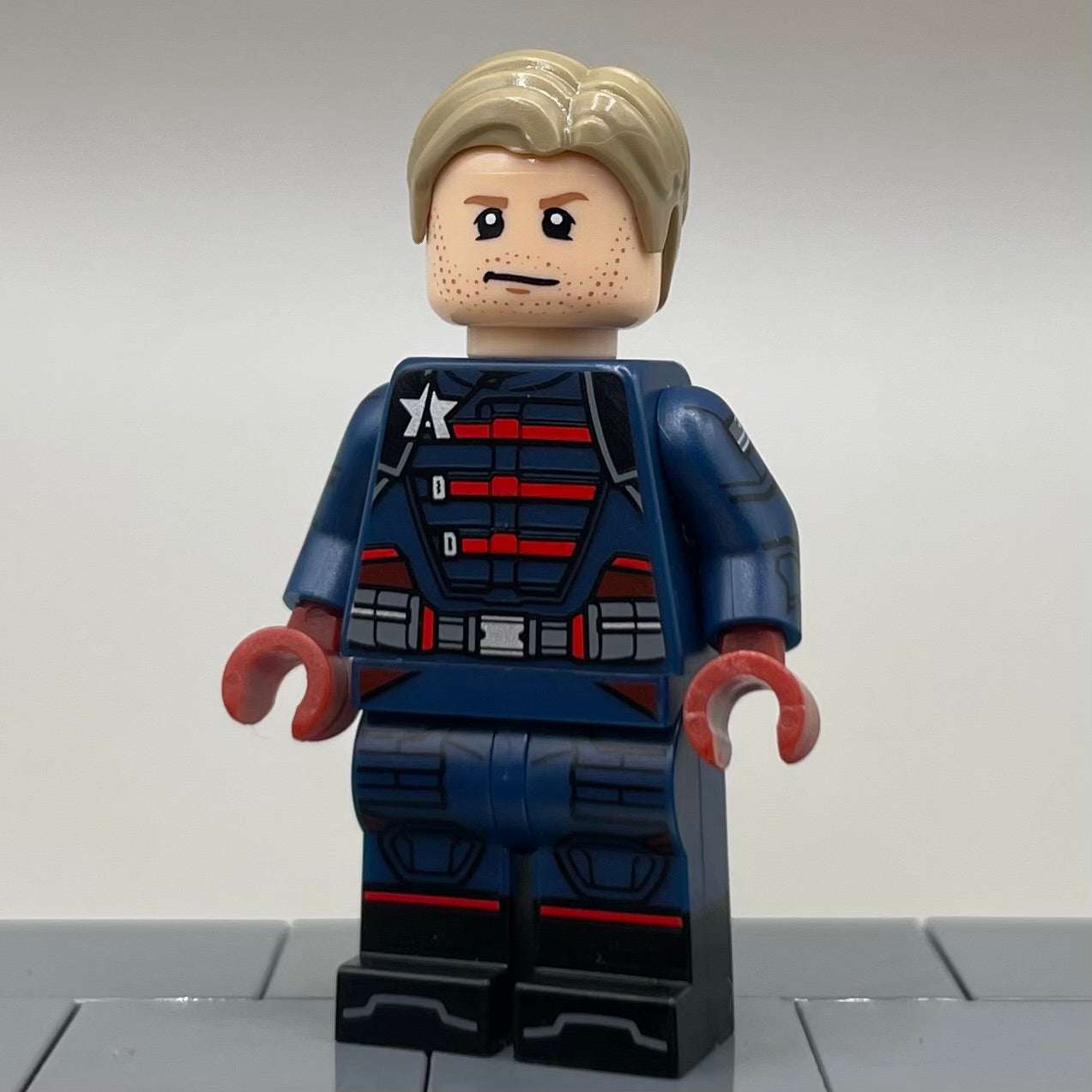 Pad printed figure on all official parts with a custom helmet. Also includes a double-sided pad printed face and steel molded hair piece.